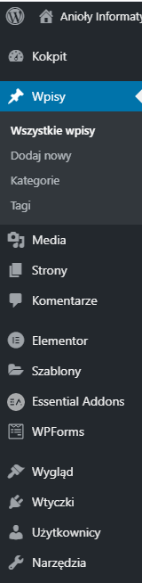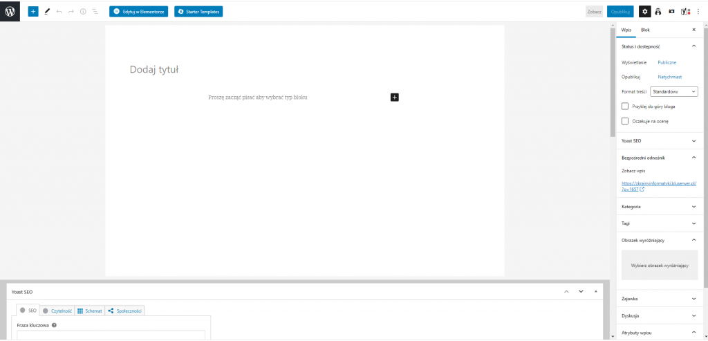 Jak widać możemy napisać wpis również za pomocą Elementora, natomiast na początek lepiej zacznijmy od oficjalnego edytora WordPressa. Po prawej stronie ekranu wyświetlaja nam się opcje. Jedynymi z najważniejszych są: Kategorie(aby dodać wpis do danej kategorii należy najpierw ją utworzyć), Tagi (w tej zakładce możemy wpisać słowa, które chcemy aby kojarzyły nam się z danym wpisie) , Obrazek wyrózniający (w tej opcji można wstawić zdjęcie, które chcemy aby wyświetlalo się jaki minaturka wpisu), Dyskusja ( w dyskusji są do zaznaczenia pola wyboru, o tym czy chcemy zezwolić na komentarze wpisu oraz na trackbacki i pingbacki).